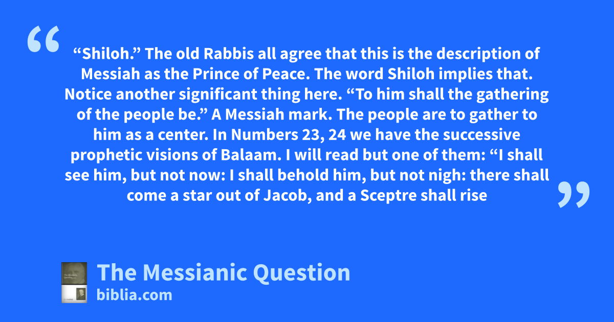 “Shiloh.” The old Rabbis all agree that this is the description of Messiah as the Prince of Peace. The word Shiloh implies that. Notice another significant thing here. “To him shall the gathering of the people be.” A Messiah mark. The people are to gather to him as a center. In Numbers 23, 24 we have the successive prophetic visions of Balaam. I will read but one of them: “I shall see him, but not now: I shall behold him, but not nigh: there shall come a star out of Jacob, and a Sceptre shall rise