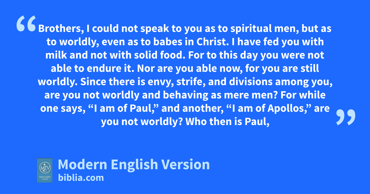 Brothers, I could not speak to you as to spiritual men, but as to worldly, even as to babes in Christ. I have fed you with milk and not with solid food. For to this day you were not able to endure it. Nor are you able now, for you are still worldly. Since there is envy, strife, and divisions among you, are you not worldly and behaving as mere men? For while one says, “I am of Paul,” and another, “I am of Apollos,” are you not worldly? Who then is Paul,
