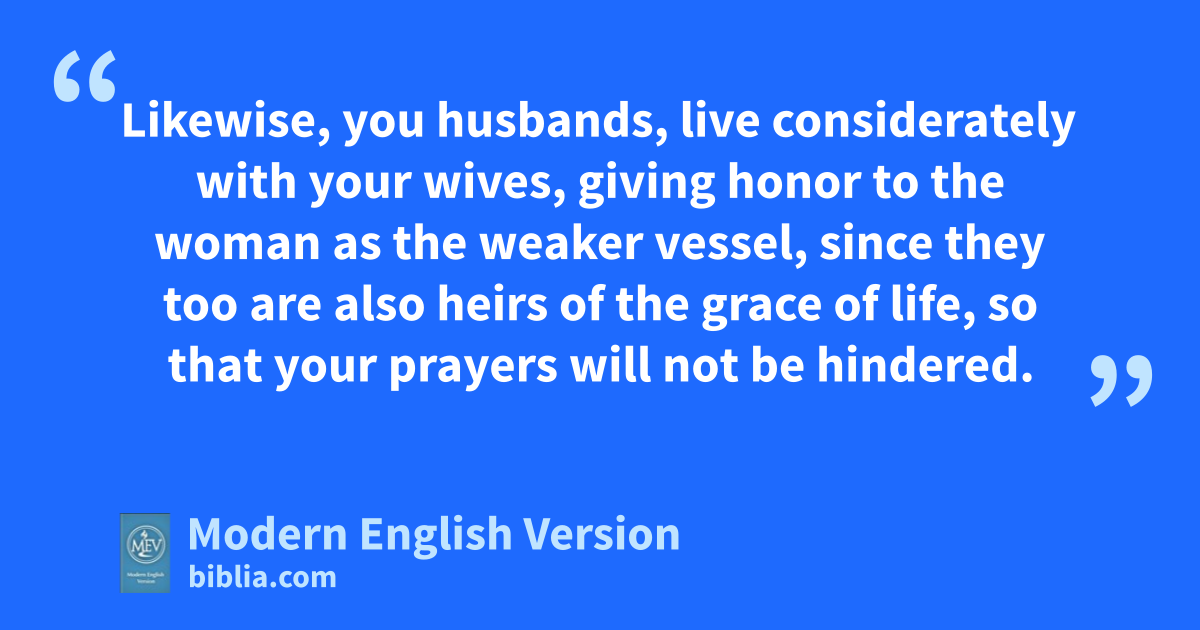 Likewise, you husbands, live considerately with your wives, giving honor to the woman as the weaker vessel, since they too are also heirs of the grace of life, so that your prayers will not be hindered.