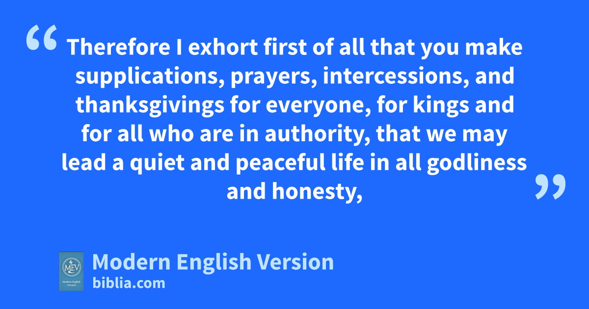 Therefore I exhort first of all that you make supplications, prayers, intercessions, and thanksgivings for everyone, for kings and for all who are in authority, that we may lead a quiet and peaceful life in all godliness and honesty,