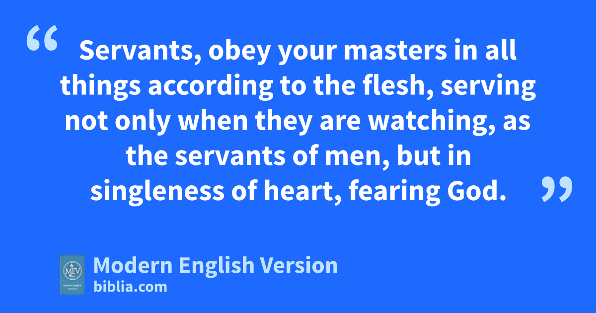 Servants, obey your masters in all things according to the flesh, serving not only when they are watching, as the servants of men, but in singleness of heart, fearing God.