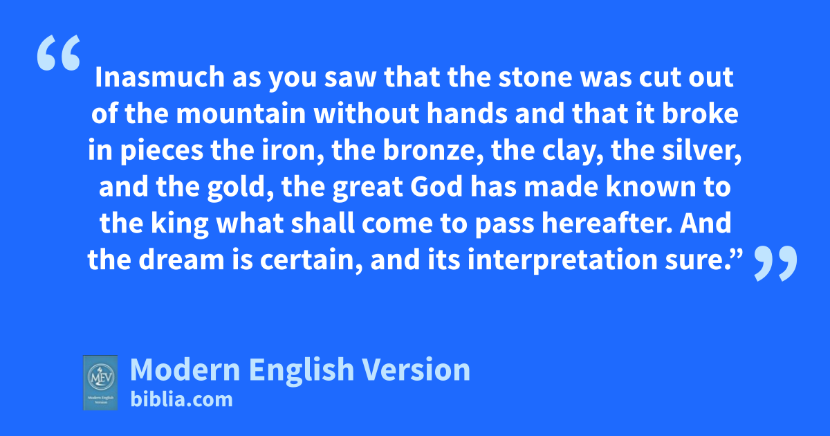 Inasmuch as you saw that the stone was cut out of the mountain without hands and that it broke in pieces the iron, the bronze, the clay, the silver, and the gold, the great God has made known to the king what shall come to pass hereafter. And the dream is certain, and its interpretation sure.”