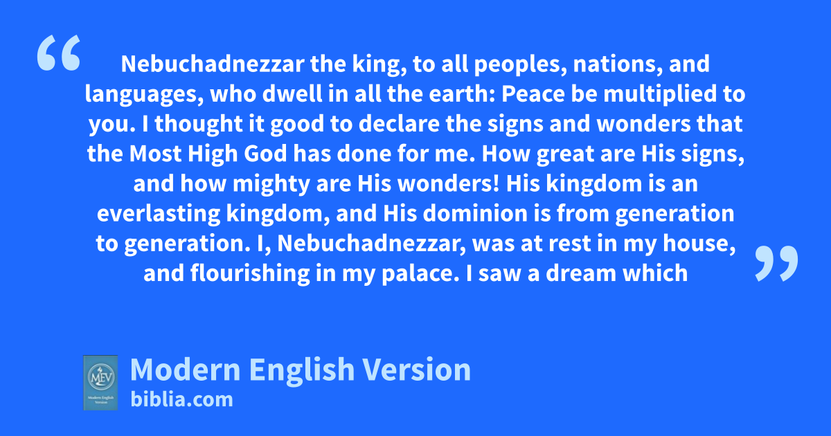 Nebuchadnezzar the king, to all peoples, nations, and languages, who dwell in all the earth: Peace be multiplied to you. I thought it good to declare the signs and wonders that the Most High God has done for me. How great are His signs, and how mighty are His wonders! His kingdom is an everlasting kingdom, and His dominion is from generation to generation. I, Nebuchadnezzar, was at rest in my house, and flourishing in my palace. I saw a dream which