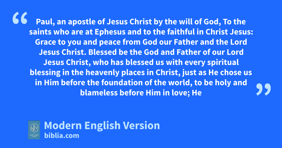 Paul, an apostle of Jesus Christ by the will of God, To the saints who are at Ephesus and to the faithful in Christ Jesus: Grace to you and peace from God our Father and the Lord Jesus Christ. Blessed be the God and Father of our Lord Jesus Christ, who has blessed us with every spiritual blessing in the heavenly places in Christ, just as He chose us in Him before the foundation of the world, to be holy and blameless before Him in love; He