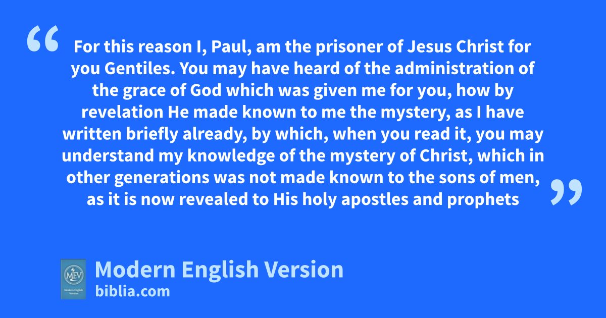 For this reason I, Paul, am the prisoner of Jesus Christ for you Gentiles. You may have heard of the administration of the grace of God which was given me for you, how by revelation He made known to me the mystery, as I have written briefly already, by which, when you read it, you may understand my knowledge of the mystery of Christ, which in other generations was not made known to the sons of men, as it is now revealed to His holy apostles and prophets