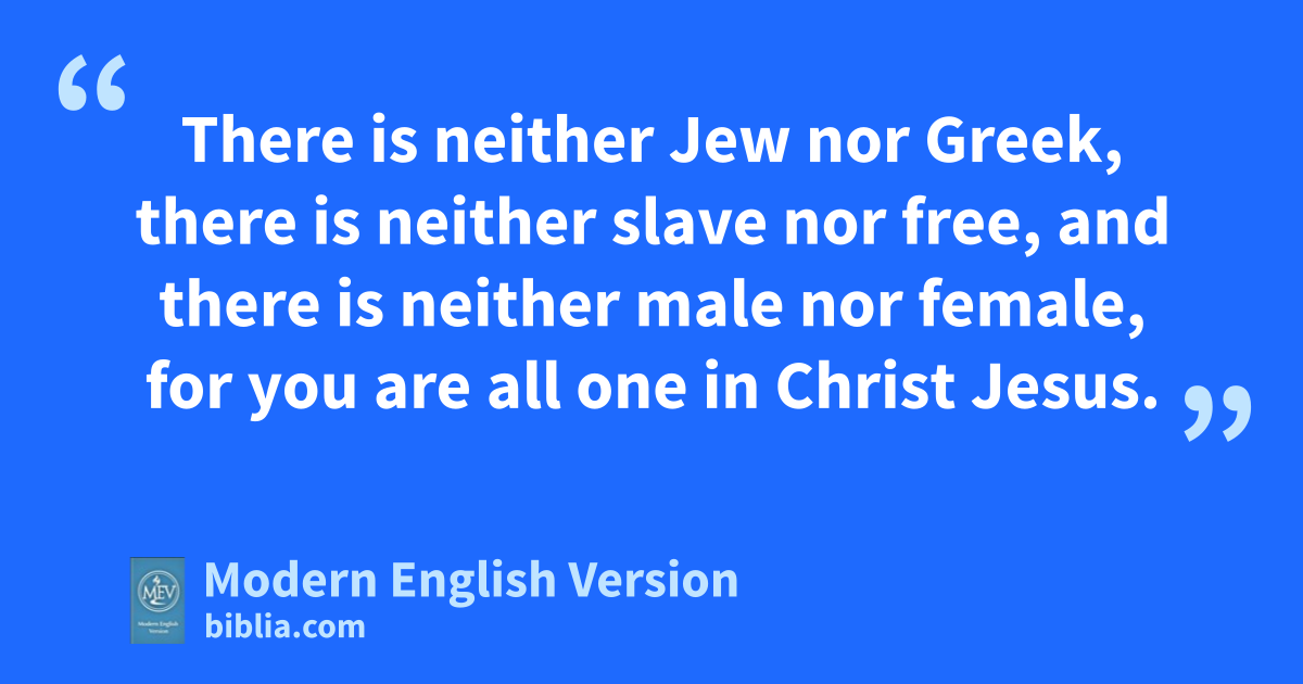 There is neither Jew nor Greek, there is neither slave nor free, and there is neither male nor female, for you are all one in Christ Jesus.