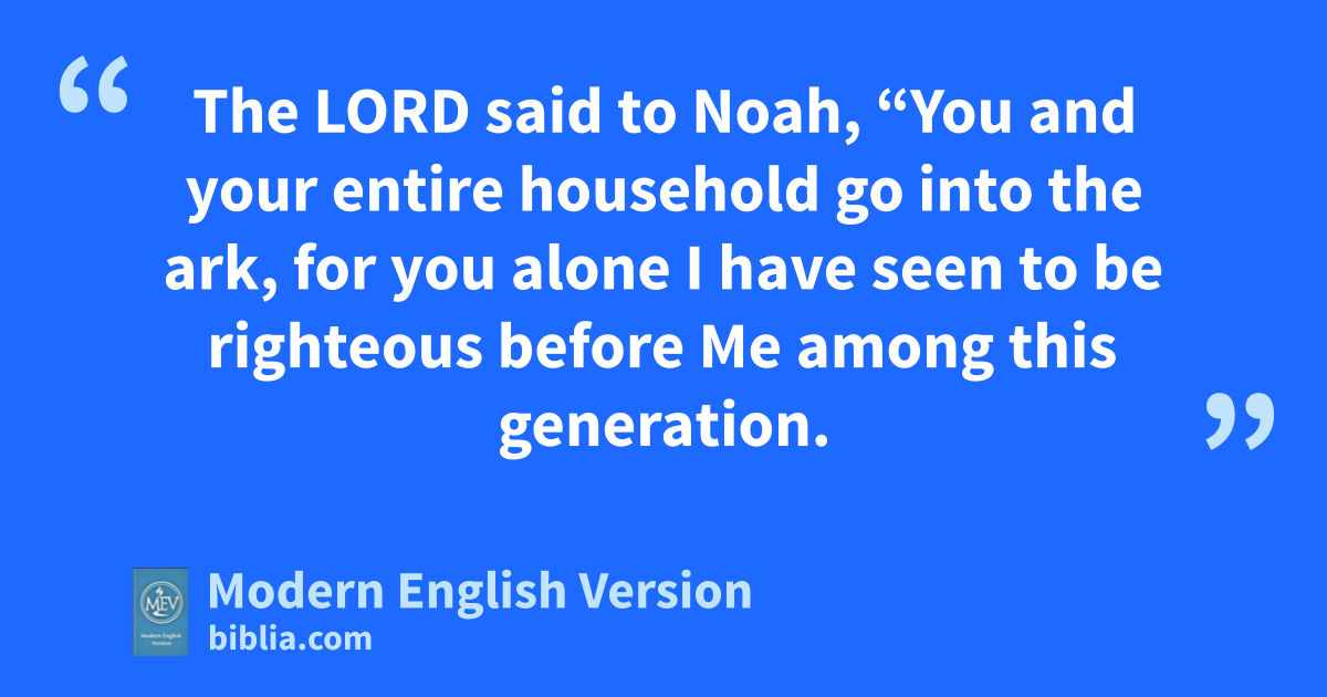 The LORD said to Noah, “You and your entire household go into the ark, for you alone I have seen to be righteous before Me among this generation.