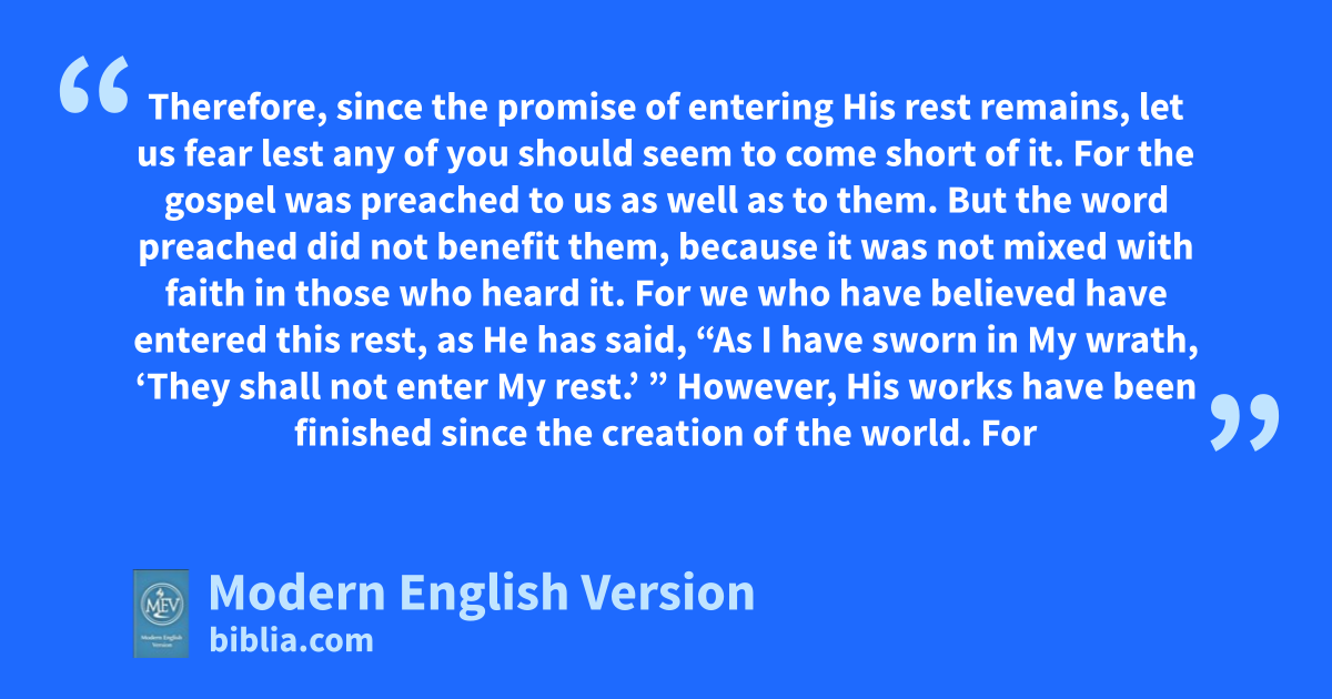 Therefore, since the promise of entering His rest remains, let us fear lest any of you should seem to come short of it. For the gospel was preached to us as well as to them. But the word preached did not benefit them, because it was not mixed with faith in those who heard it. For we who have believed have entered this rest, as He has said, “As I have sworn in My wrath, ‘They shall not enter My rest.’ ” However, His works have been finished since the creation of the world. For