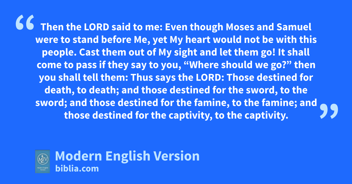 Then the LORD said to me: Even though Moses and Samuel were to stand before Me, yet My heart would not be with this people. Cast them out of My sight and let them go! It shall come to pass if they say to you, “Where should we go?” then you shall tell them: Thus says the LORD: Those destined for death, to death; and those destined for the sword, to the sword; and those destined for the famine, to the famine; and those destined for the captivity, to the captivity.