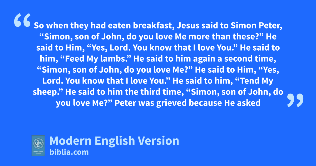 So when they had eaten breakfast, Jesus said to Simon Peter, “Simon, son of John, do you love Me more than these?” He said to Him, “Yes, Lord. You know that I love You.” He said to him, “Feed My lambs.” He said to him again a second time, “Simon, son of John, do you love Me?” He said to Him, “Yes, Lord. You know that I love You.” He said to him, “Tend My sheep.” He said to him the third time, “Simon, son of John, do you love Me?” Peter was grieved because He asked