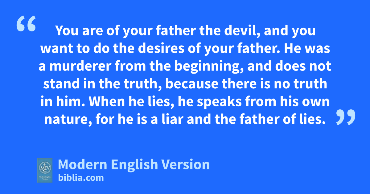 You are of your father the devil, and you want to do the desires of your father. He was a murderer from the beginning, and does not stand in the truth, because there is no truth in him. When he lies, he speaks from his own nature, for he is a liar and the father of lies.