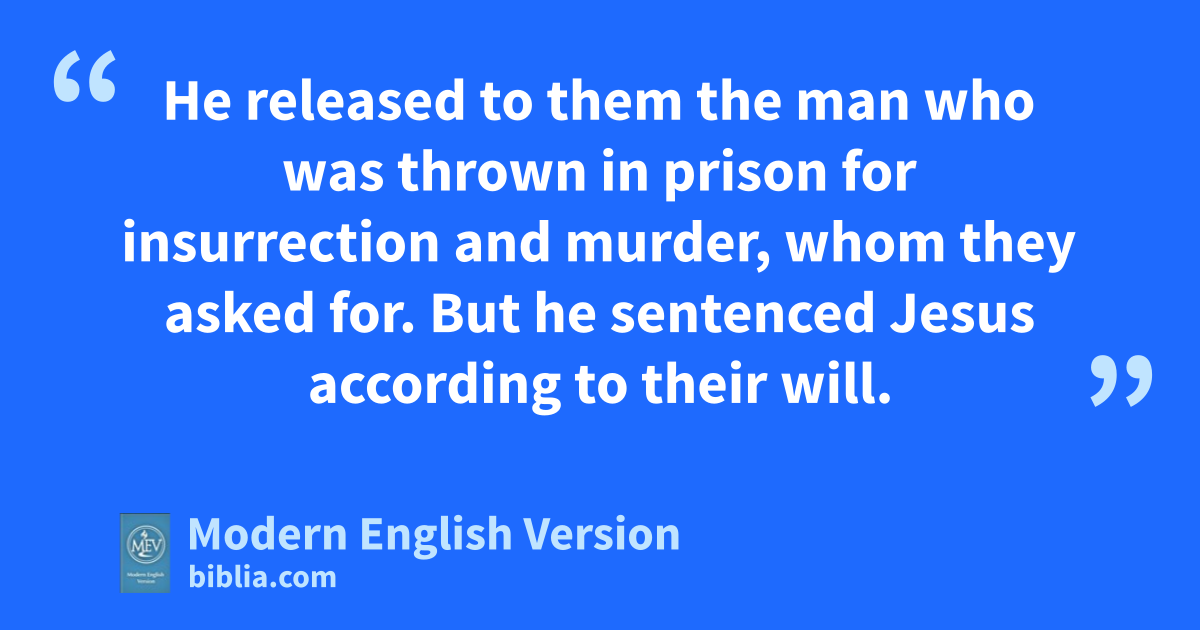 He released to them the man who was thrown in prison for insurrection and murder, whom they asked for. But he sentenced Jesus according to their will.