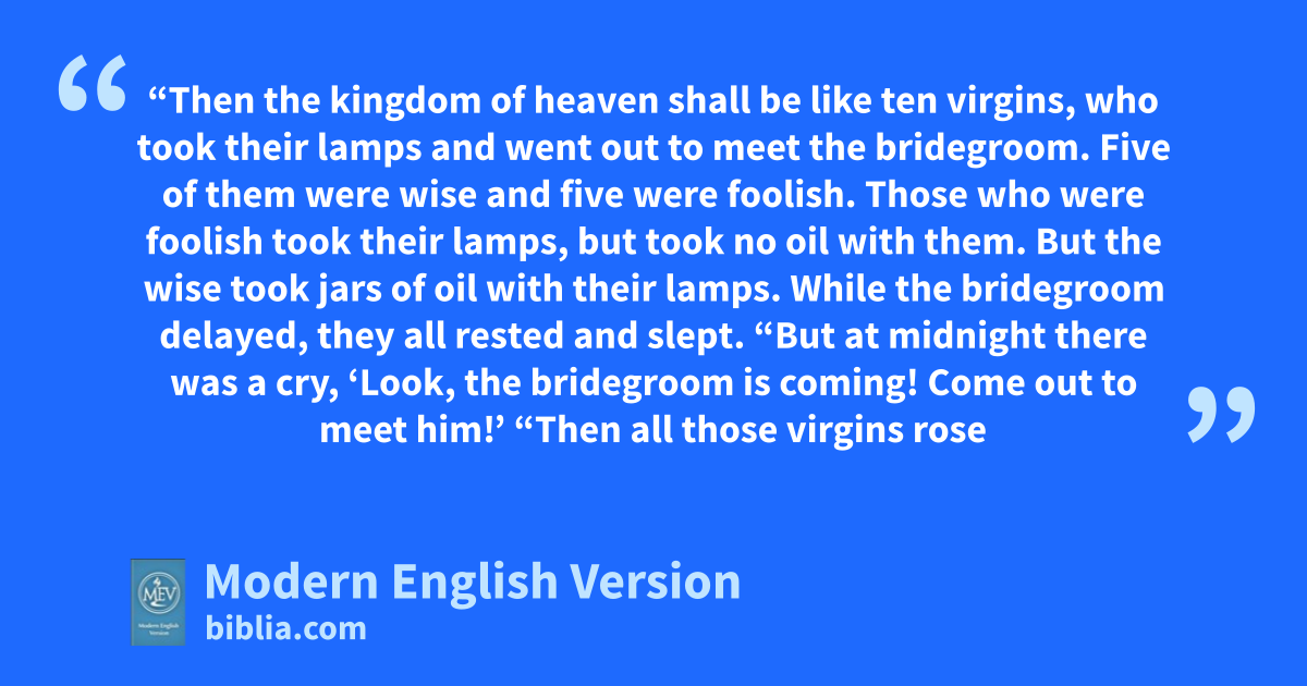 “Then the kingdom of heaven shall be like ten virgins, who took their lamps and went out to meet the bridegroom. Five of them were wise and five were foolish. Those who were foolish took their lamps, but took no oil with them. But the wise took jars of oil with their lamps. While the bridegroom delayed, they all rested and slept. “But at midnight there was a cry, ‘Look, the bridegroom is coming! Come out to meet him!’ “Then all those virgins rose