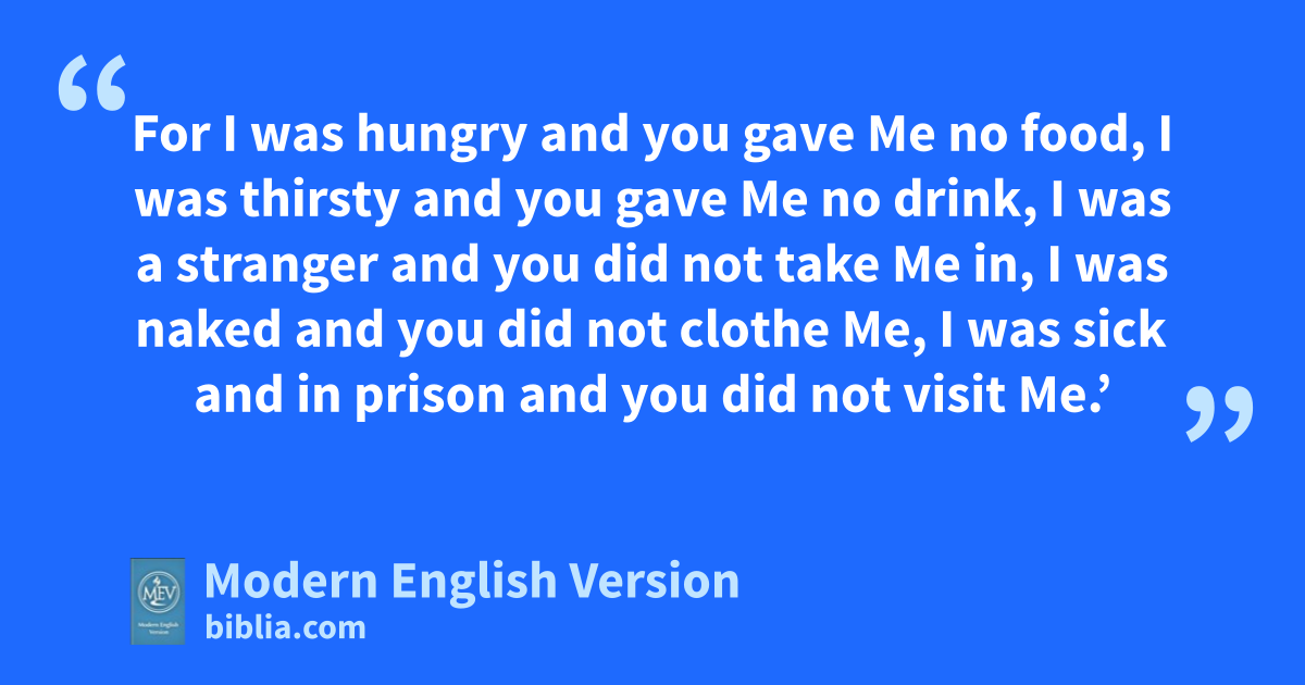 For I was hungry and you gave Me no food, I was thirsty and you gave Me no drink, I was a stranger and you did not take Me in, I was naked and you did not clothe Me, I was sick and in prison and you did not visit Me.’