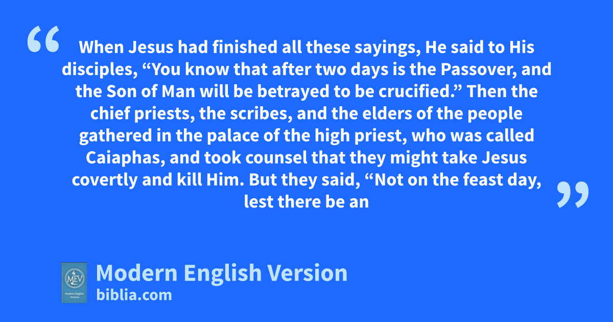 When Jesus had finished all these sayings, He said to His disciples, “You know that after two days is the Passover, and the Son of Man will be betrayed to be crucified.” Then the chief priests, the scribes, and the elders of the people gathered in the palace of the high priest, who was called Caiaphas, and took counsel that they might take Jesus covertly and kill Him. But they said, “Not on the feast day, lest there be an