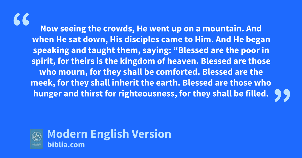 Now seeing the crowds, He went up on a mountain. And when He sat down, His disciples came to Him. And He began speaking and taught them, saying: “Blessed are the poor in spirit, for theirs is the kingdom of heaven. Blessed are those who mourn, for they shall be comforted. Blessed are the meek, for they shall inherit the earth. Blessed are those who hunger and thirst for righteousness, for they shall be filled.