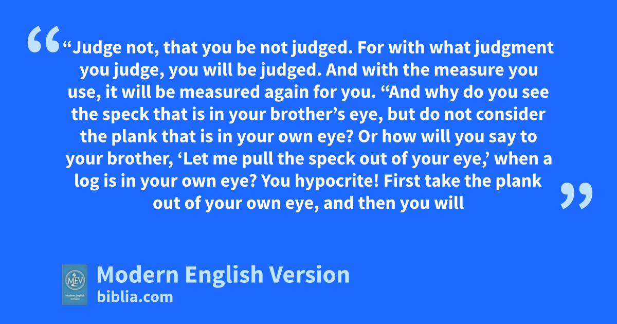 “Judge not, that you be not judged. For with what judgment you judge, you will be judged. And with the measure you use, it will be measured again for you. “And why do you see the speck that is in your brother’s eye, but do not consider the plank that is in your own eye? Or how will you say to your brother, ‘Let me pull the speck out of your eye,’ when a log is in your own eye? You hypocrite! First take the plank out of your own eye, and then you will
