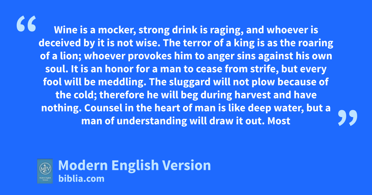 Wine is a mocker, strong drink is raging, and whoever is deceived by it is not wise. The terror of a king is as the roaring of a lion; whoever provokes him to anger sins against his own soul. It is an honor for a man to cease from strife, but every fool will be meddling. The sluggard will not plow because of the cold; therefore he will beg during harvest and have nothing. Counsel in the heart of man is like deep water, but a man of understanding will draw it out. Most