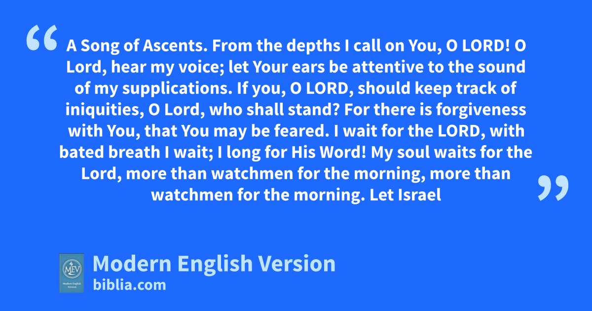 A Song of Ascents. From the depths I call on You, O LORD! O Lord, hear my voice; let Your ears be attentive to the sound of my supplications. If you, O LORD, should keep track of iniquities, O Lord, who shall stand? For there is forgiveness with You, that You may be feared. I wait for the LORD, with bated breath I wait; I long for His Word! My soul waits for the Lord, more than watchmen for the morning, more than watchmen for the morning. Let Israel