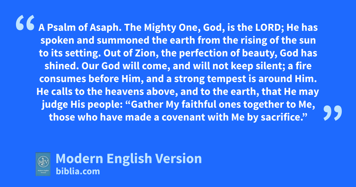 A Psalm of Asaph. The Mighty One, God, is the LORD; He has spoken and summoned the earth from the rising of the sun to its setting. Out of Zion, the perfection of beauty, God has shined. Our God will come, and will not keep silent; a fire consumes before Him, and a strong tempest is around Him. He calls to the heavens above, and to the earth, that He may judge His people: “Gather My faithful ones together to Me, those who have made a covenant with Me by sacrifice.”