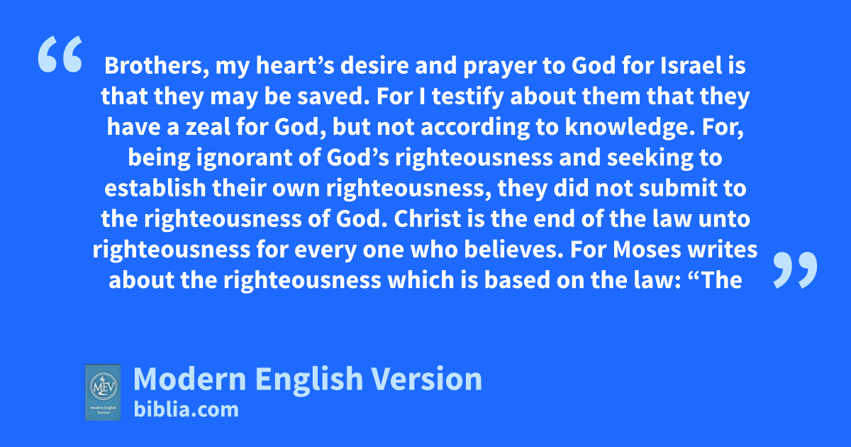 Brothers, my heart’s desire and prayer to God for Israel is that they may be saved. For I testify about them that they have a zeal for God, but not according to knowledge. For, being ignorant of God’s righteousness and seeking to establish their own righteousness, they did not submit to the righteousness of God. Christ is the end of the law unto righteousness for every one who believes. For Moses writes about the righteousness which is based on the law: “The