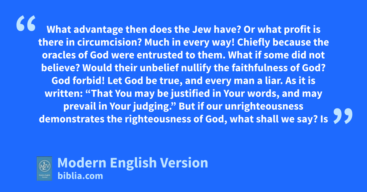 What advantage then does the Jew have? Or what profit is there in circumcision? Much in every way! Chiefly because the oracles of God were entrusted to them. What if some did not believe? Would their unbelief nullify the faithfulness of God? God forbid! Let God be true, and every man a liar. As it is written: “That You may be justified in Your words, and may prevail in Your judging.” But if our unrighteousness demonstrates the righteousness of God, what shall we say? Is