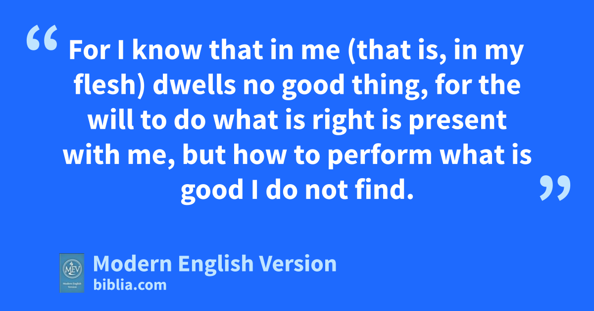 For I know that in me (that is, in my flesh) dwells no good thing, for the will to do what is right is present with me, but how to perform what is good I do not find.