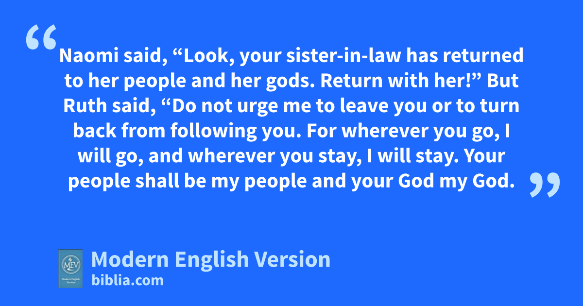 Naomi said, “Look, your sister-in-law has returned to her people and her gods. Return with her!” But Ruth said, “Do not urge me to leave you or to turn back from following you. For wherever you go, I will go, and wherever you stay, I will stay. Your people shall be my people and your God my God.