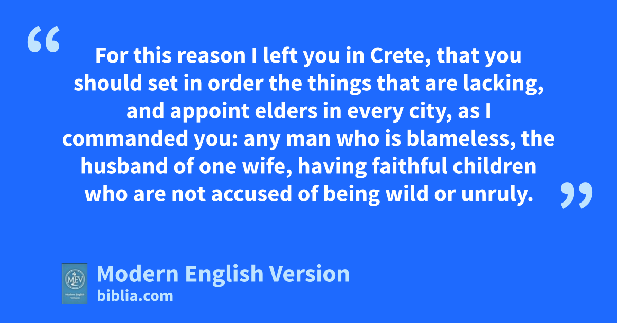 For this reason I left you in Crete, that you should set in order the things that are lacking, and appoint elders in every city, as I commanded you: any man who is blameless, the husband of one wife, having faithful children who are not accused of being wild or unruly.