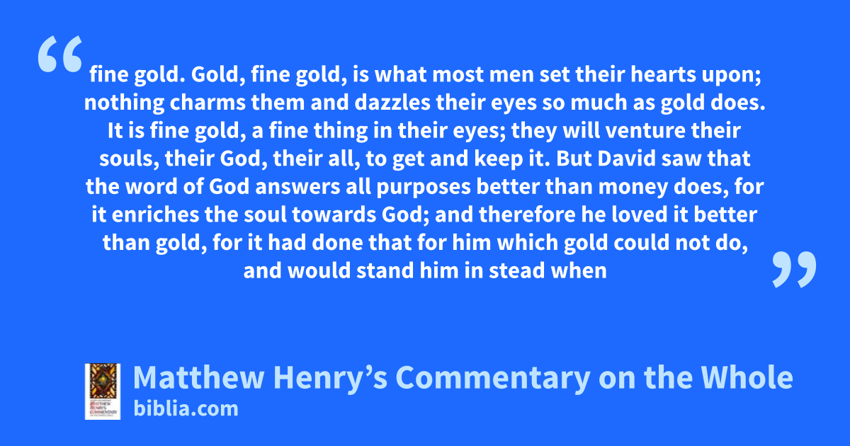 fine gold. Gold, fine gold, is what most men set their hearts upon; nothing charms them and dazzles their eyes so much as gold does. It is fine gold, a fine thing in their eyes; they will venture their souls, their God, their all, to get and keep it. But David saw that the word of God answers all purposes better than money does, for it enriches the soul towards God; and therefore he loved it better than gold, for it had done that for him which gold could not do, and would stand him in stead when