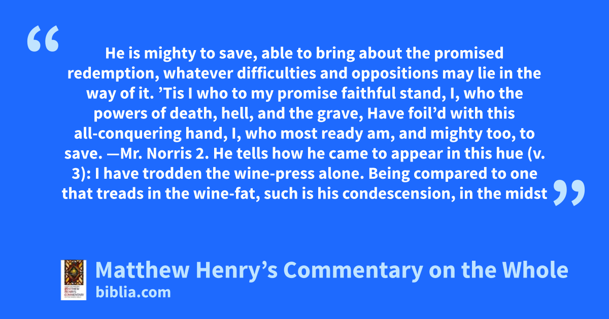 He is mighty to save, able to bring about the promised redemption, whatever difficulties and oppositions may lie in the way of it. ’Tis I who to my promise faithful stand, I, who the powers of death, hell, and the grave, Have foil’d with this all-conquering hand, I, who most ready am, and mighty too, to save. —Mr. Norris 2. He tells how he came to appear in this hue (v. 3): I have trodden the wine-press alone. Being compared to one that treads in the wine-fat, such is his condescension, in the midst