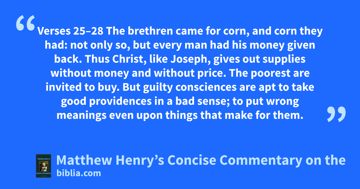 The brethren came for corn, and corn they had: not only so, but every man had his money given back. Thus Christ, like Joseph, gives out supplies without money and without price. The poorest are invited to buy. But guilty consciences are apt to take good providences in a bad sense; to put wrong meanings even upon things that make for them.
