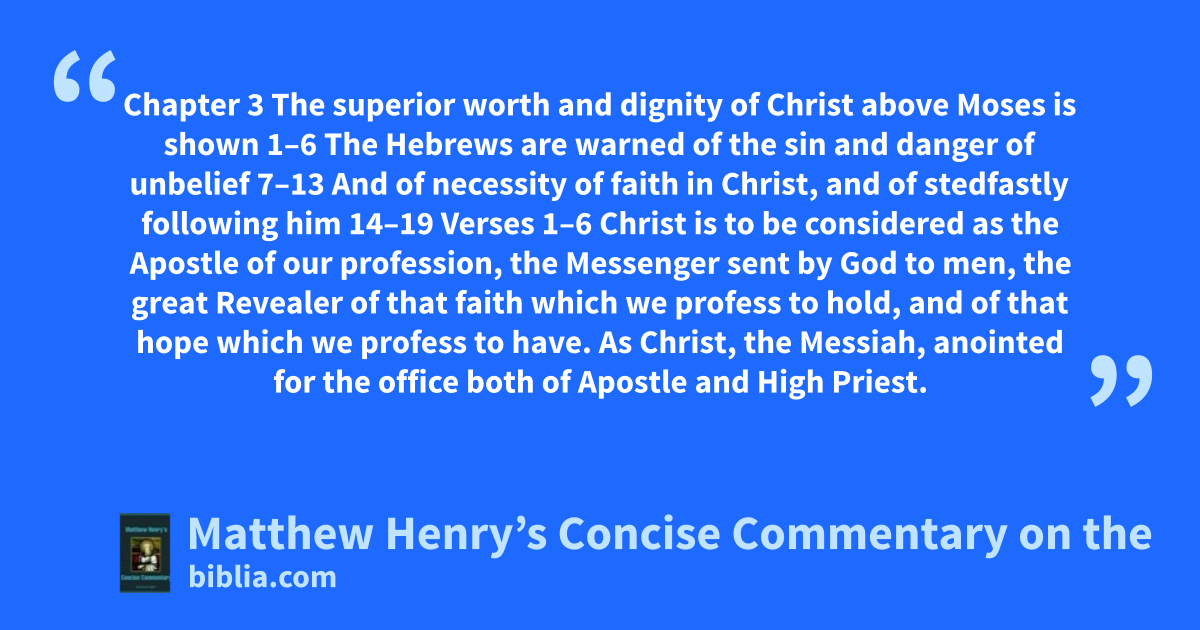 Christ is to be considered as the Apostle of our profession, the Messenger sent by God to men, the great Revealer of that faith which we profess to hold, and of that hope which we profess to have. As Christ, the Messiah, anointed for the office both of Apostle and High Priest. As Jesus, our Saviour, our Healer, the great Physician of souls. Consider him thus. Consider what he is in himself, what he is to us, and what he will be to us hereafter and for ever. Close and serious thoughts of Christ bring us to know more of him. The Jews had a high opinion of the faithfulness of Moses, yet his faithfulness was but a type of Christ’s. Christ was the Master of this house, of his church, his people, as well as their Maker. Moses was a faithful servant; Christ, as the eternal Son of God, is rightful Owner and Sovereign Ruler of the Church. There must not only be setting out well in the ways of Christ, but stedfastness and perseverance therein to the end. Every meditation on his person and his salvation, will suggest more wisdom, new motives to love, confidence, and obedience.