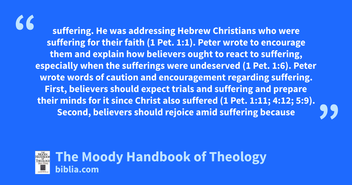 suffering. He was addressing Hebrew Christians who were suffering for their faith (1 Pet. 1:1). Peter wrote to encourage them and explain how believers ought to react to suffering, especially when the sufferings were undeserved (1 Pet. 1:6). Peter wrote words of caution and encouragement regarding suffering. First, believers should expect trials and suffering and prepare their minds for it since Christ also suffered (1 Pet. 1:11; 4:12; 5:9). Second, believers should rejoice amid suffering because