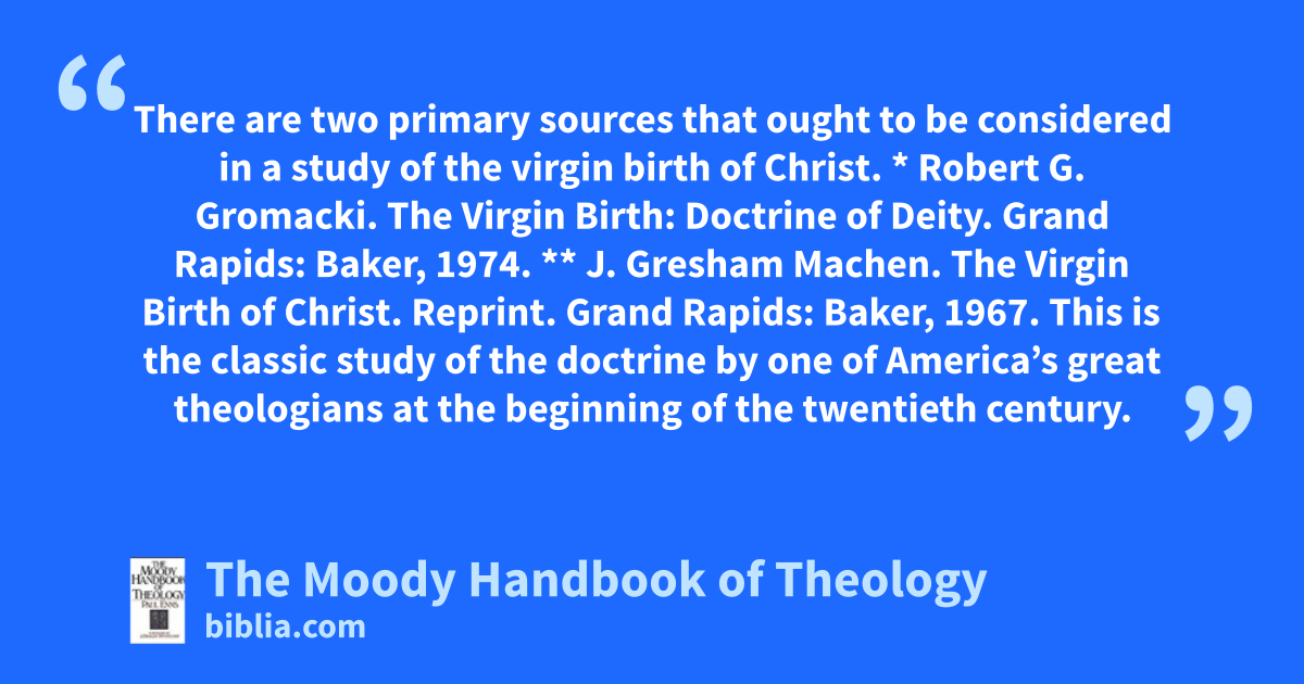 There are two primary sources that ought to be considered in a study of the virgin birth of Christ. * Robert G. Gromacki. The Virgin Birth: Doctrine of Deity. Grand Rapids: Baker, 1974. ** J. Gresham Machen. The Virgin Birth of Christ. Reprint. Grand Rapids: Baker, 1967. This is the classic study of the doctrine by one of America’s great theologians at the beginning of the twentieth century.
