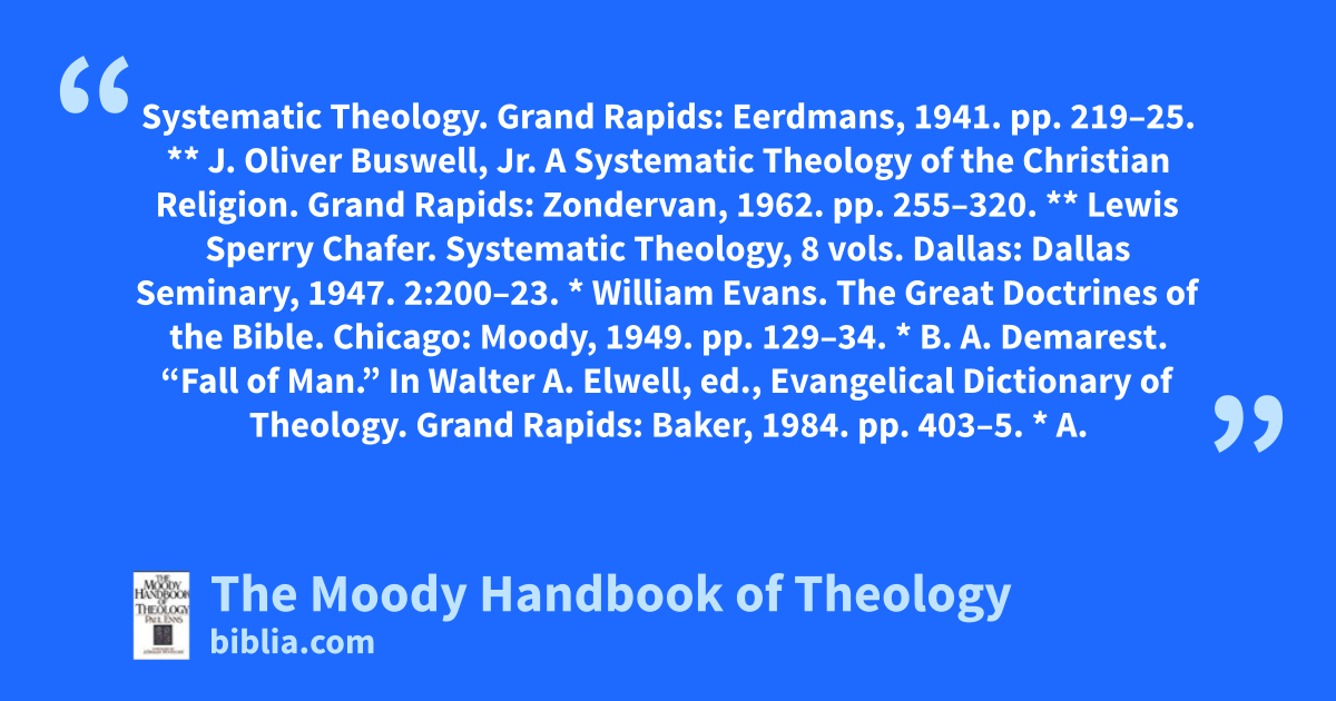 Systematic Theology. Grand Rapids: Eerdmans, 1941. pp. 219–25. ** J. Oliver Buswell, Jr. A Systematic Theology of the Christian Religion. Grand Rapids: Zondervan, 1962. pp. 255–320. ** Lewis Sperry Chafer. Systematic Theology, 8 vols. Dallas: Dallas Seminary, 1947. 2:200–23. * William Evans. The Great Doctrines of the Bible. Chicago: Moody, 1949. pp. 129–34. * B. A. Demarest. “Fall of Man.” In Walter A. Elwell, ed., Evangelical Dictionary of Theology. Grand Rapids: Baker, 1984. pp. 403–5. * A.