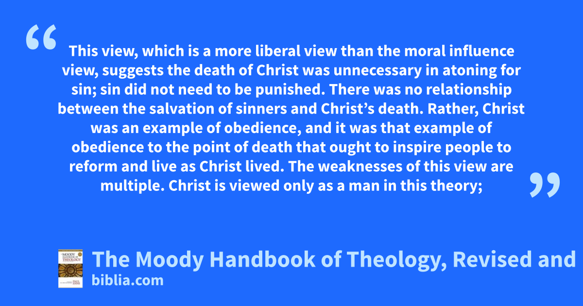 This view, which is a more liberal view than the moral influence view, suggests the death of Christ was unnecessary in atoning for sin; sin did not need to be punished. There was no relationship between the salvation of sinners and Christ’s death. Rather, Christ was an example of obedience, and it was that example of obedience to the point of death that ought to inspire people to reform and live as Christ lived. The weaknesses of this view are multiple. Christ is viewed only as a man in this theory;