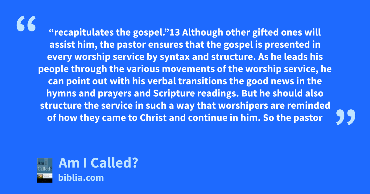 “recapitulates the gospel.”13 Although other gifted ones will assist him, the pastor ensures that the gospel is presented in every worship service by syntax and structure. As he leads his people through the various movements of the worship service, he can point out with his verbal transitions the good news in the hymns and prayers and Scripture readings. But he should also structure the service in such a way that worshipers are reminded of how they came to Christ and continue in him. So the pastor