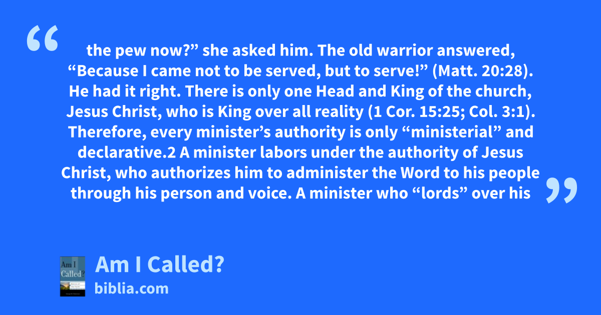 the pew now?” she asked him. The old warrior answered, “Because I came not to be served, but to serve!” (Matt. 20:28). He had it right. There is only one Head and King of the church, Jesus Christ, who is King over all reality (1 Cor. 15:25; Col. 3:1). Therefore, every minister’s authority is only “ministerial” and declarative.2 A minister labors under the authority of Jesus Christ, who authorizes him to administer the Word to his people through his person and voice. A minister who “lords” over his
