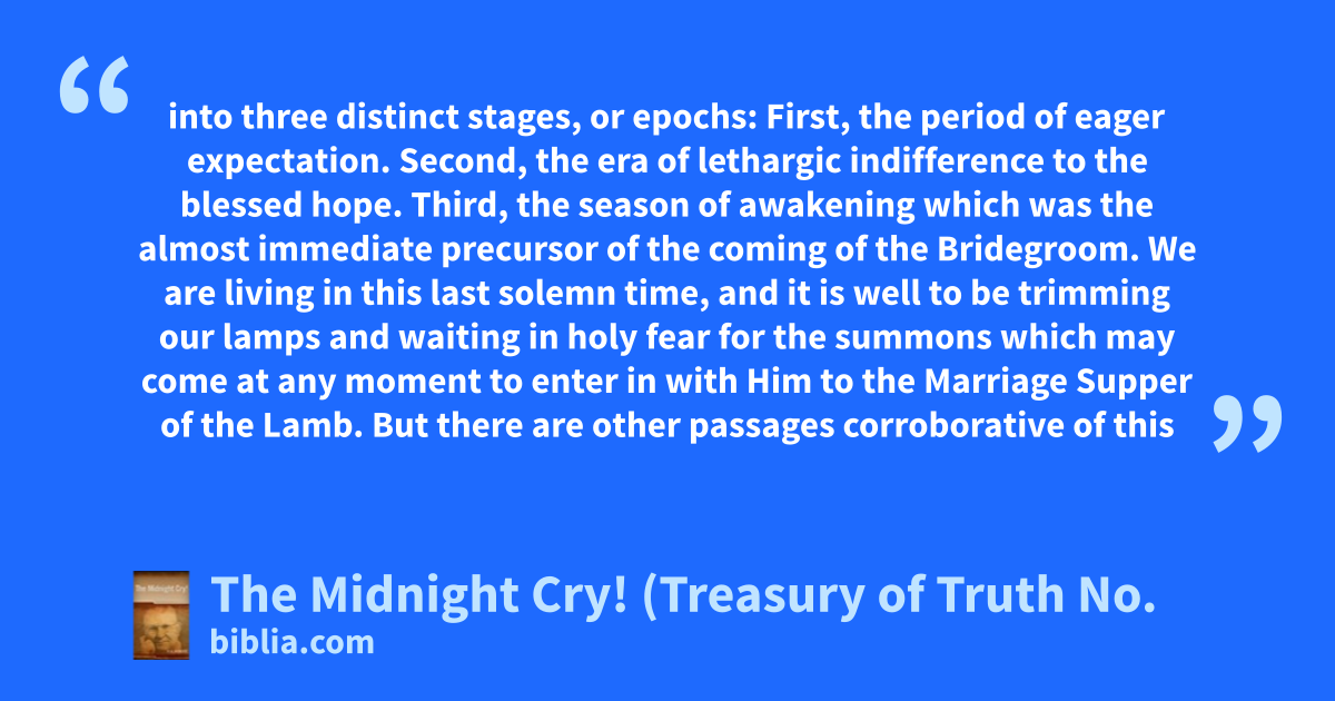 into three distinct stages, or epochs: First, the period of eager expectation. Second, the era of lethargic indifference to the blessed hope. Third, the season of awakening which was the almost immediate precursor of the coming of the Bridegroom. We are living in this last solemn time, and it is well to be trimming our lamps and waiting in holy fear for the summons which may come at any moment to enter in with Him to the Marriage Supper of the Lamb. But there are other passages corroborative of this