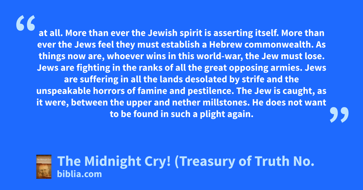 at all. More than ever the Jewish spirit is asserting itself. More than ever the Jews feel they must establish a Hebrew commonwealth. As things now are, whoever wins in this world-war, the Jew must lose. Jews are fighting in the ranks of all the great opposing armies. Jews are suffering in all the lands desolated by strife and the unspeakable horrors of famine and pestilence. The Jew is caught, as it were, between the upper and nether millstones. He does not want to be found in such a plight again.