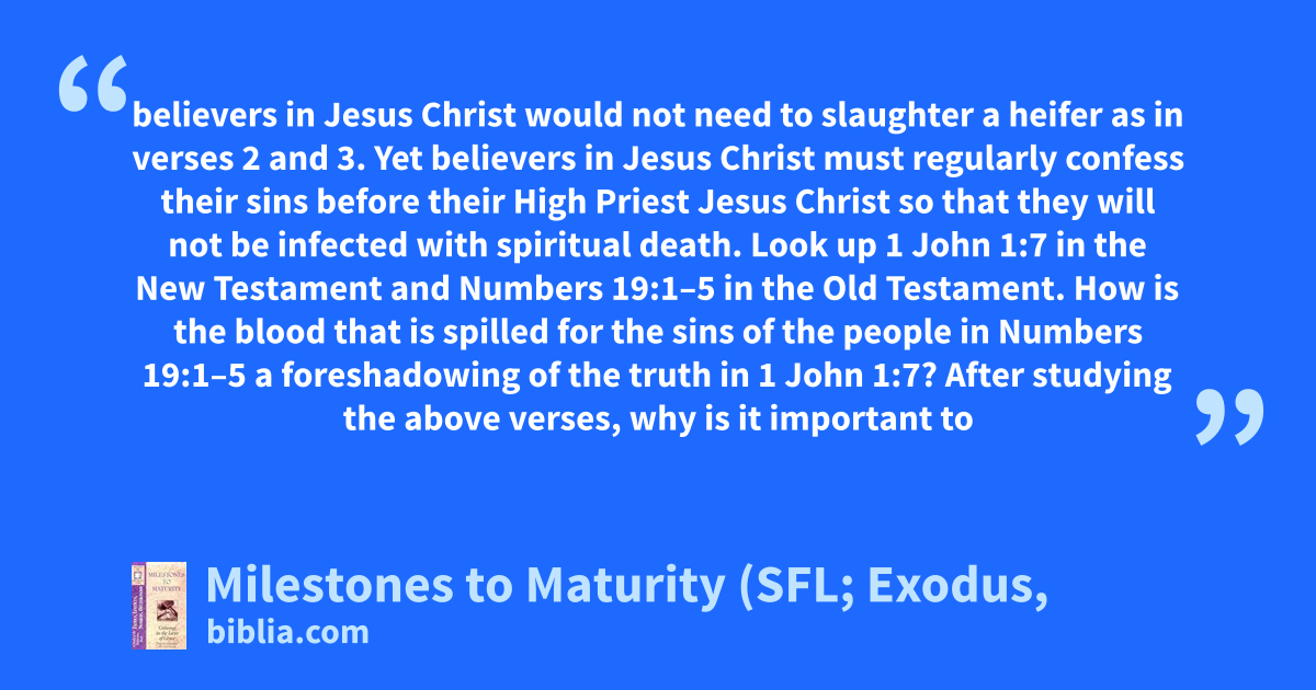 believers in Jesus Christ would not need to slaughter a heifer as in verses 2 and 3. Yet believers in Jesus Christ must regularly confess their sins before their High Priest Jesus Christ so that they will not be infected with spiritual death. Look up 1 John 1:7 in the New Testament and Numbers 19:1–5 in the Old Testament. How is the blood that is spilled for the sins of the people in Numbers 19:1–5 a foreshadowing of the truth in 1 John 1:7? After studying the above verses, why is it important to