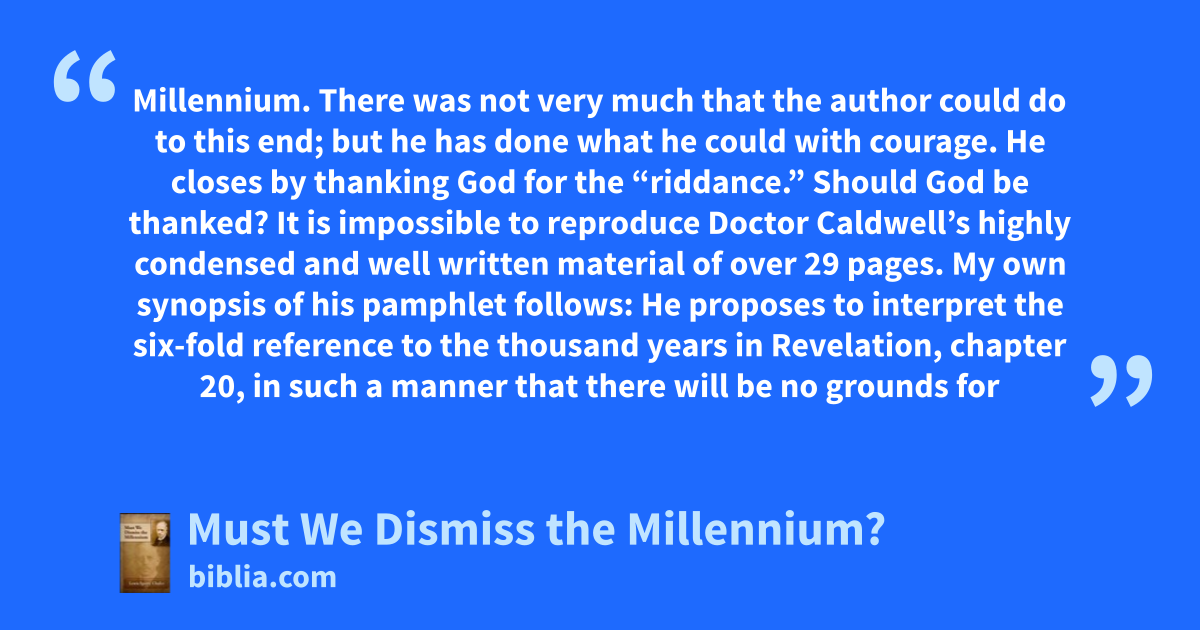 Millennium. There was not very much that the author could do to this end; but he has done what he could with courage. He closes by thanking God for the “riddance.” Should God be thanked? It is impossible to reproduce Doctor Caldwell’s highly condensed and well written material of over 29 pages. My own synopsis of his pamphlet follows: He proposes to interpret the six-fold reference to the thousand years in Revelation, chapter 20, in such a manner that there will be no grounds for
