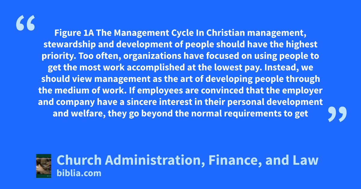 Figure 1A The Management Cycle In Christian management, stewardship and development of people should have the highest priority. Too often, organizations have focused on using people to get the most work accomplished at the lowest pay. Instead, we should view management as the art of developing people through the medium of work. If employees are convinced that the employer and company have a sincere interest in their personal development and welfare, they go beyond the normal requirements to get