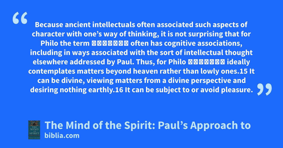 Because ancient intellectuals often associated such aspects of character with one’s way of thinking, it is not surprising that for Philo the term φρόνημα often has cognitive associations, including in ways associated with the sort of intellectual thought elsewhere addressed by Paul. Thus, for Philo φρόνημα ideally contemplates matters beyond heaven rather than lowly ones.15 It can be divine, viewing matters from a divine perspective and desiring nothing earthly.16 It can be subject to or avoid pleasure.