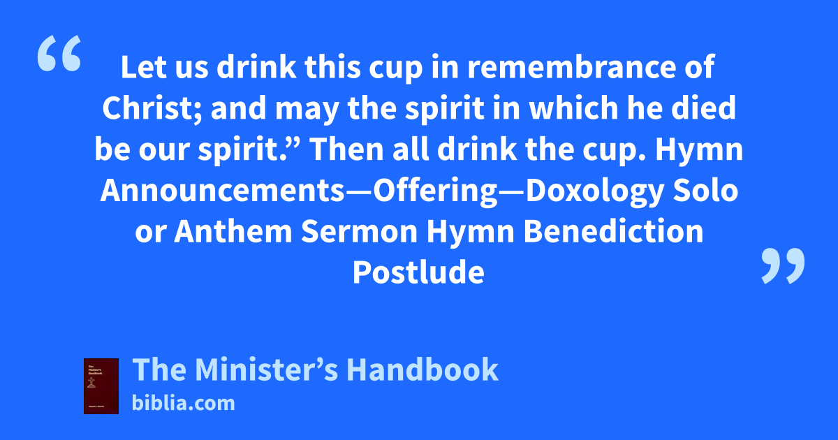 Let us drink this cup in remembrance of Christ; and may the spirit in which he died be our spirit.” Then all drink the cup. Hymn Announcements—Offering—Doxology Solo or Anthem Sermon Hymn Benediction Postlude
