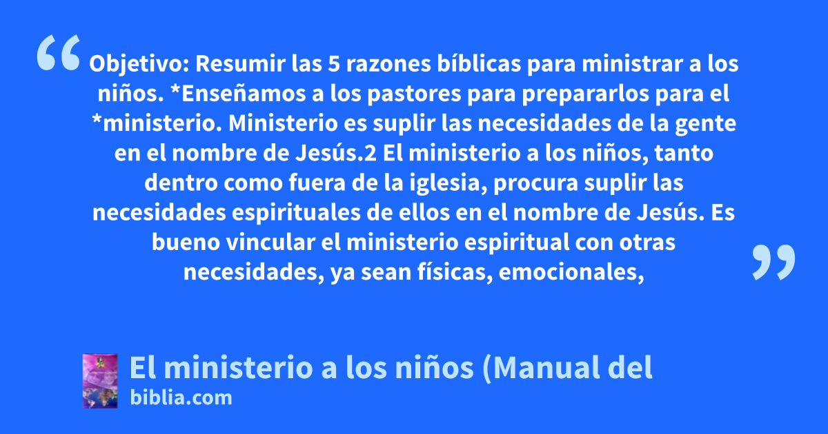 Objetivo: Resumir las 5 razones bíblicas para ministrar a los niños. *Enseñamos a los pastores para prepararlos para el *ministerio. Ministerio es suplir las necesidades de la gente en el nombre de Jesús.2 El ministerio a los niños, tanto dentro como fuera de la iglesia, procura suplir las necesidades espirituales de ellos en el nombre de Jesús. Es bueno vincular el ministerio espiritual con otras necesidades, ya sean físicas, emocionales,