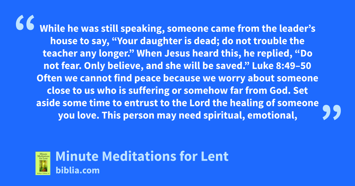 While he was still speaking, someone came from the leader’s house to say, “Your daughter is dead; do not trouble the teacher any longer.” When Jesus heard this, he replied, “Do not fear. Only believe, and she will be saved.” Luke 8:49–50 Often we cannot find peace because we worry about someone close to us who is suffering or somehow far from God. Set aside some time to entrust to the Lord the healing of someone you love. This person may need spiritual, emotional,