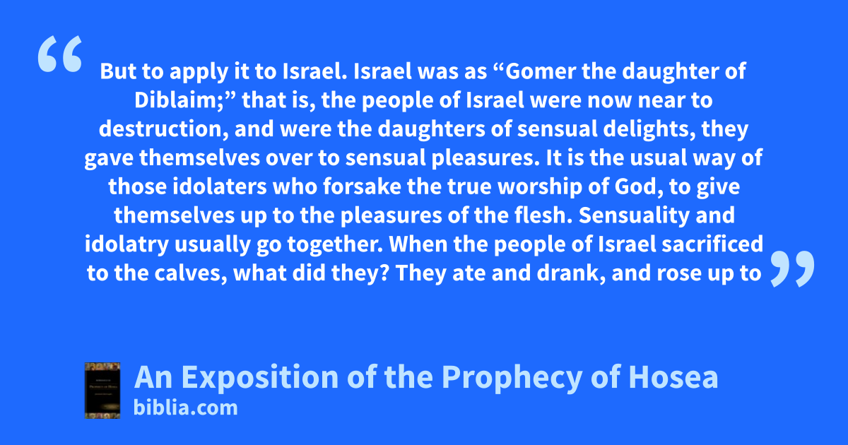 But to apply it to Israel. Israel was as “Gomer the daughter of Diblaim;” that is, the people of Israel were now near to destruction, and were the daughters of sensual delights, they gave themselves over to sensual pleasures. It is the usual way of those idolaters who forsake the true worship of God, to give themselves up to the pleasures of the flesh. Sensuality and idolatry usually go together. When the people of Israel sacrificed to the calves, what did they? They ate and drank, and rose up to