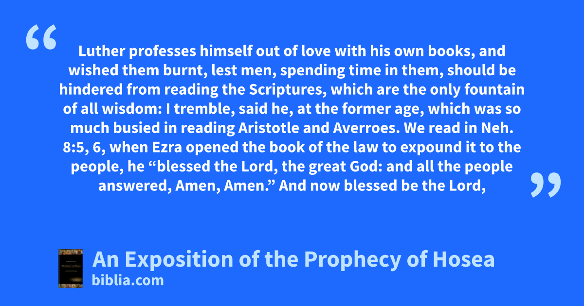 Luther professes himself out of love with his own books, and wished them burnt, lest men, spending time in them, should be hindered from reading the Scriptures, which are the only fountain of all wisdom: I tremble, said he, at the former age, which was so much busied in reading Aristotle and Averroes. We read in Neh. 8:5, 6, when Ezra opened the book of the law to expound it to the people, he “blessed the Lord, the great God: and all the people answered, Amen, Amen.” And now blessed be the Lord,